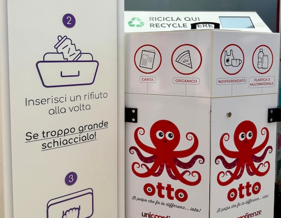 Otto, un bel bidone bianco esagonale, con un grande octopus disegnato su ogni faccia e una bocca sulla cima, utilizza un sistema brevettato che lo rende capace di riconoscere, analizzare e classificare automaticamente i rifiuti, stimandone peso, volume e impatto ambientale. Ci riesce grazie all’utilizzo di una telecamera interna che scansiona i rifiuti, sensori che ne calcolano il peso e un database di oltre un milione di foto di possibili scarti di ogni tipo: dopo la scansione, il robot associa l’oggetto all’immagine che più si avvicina ad essa, e lo direziona nel relativo contenitore. Migliora col tempo, perché man mano che “lavora”, il computer immagazzina nuove informazioni, e nel frattempo svolge anche una funzione educativa: per ogni conferimento il monitor informa il cliente sul tipo di rifiuto e indica la quantità di CO2 non emessa, un modo per sensibilizzarlo e renderlo più consapevole sull’importanza di certi piccoli gesti. «La sua precisione nel riconoscere e smistare i rifiuti, riducendo drasticamente l'indifferenziato, non è solo un avanzamento tecnologico, ma un passo concreto verso la sostenibilità ambientale e una maggiore consapevolezza nel riciclo», è la sintesi del cofondatore di Ganiga Innovation, Nicolas Lorenzo Zeoli.